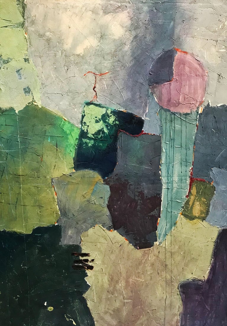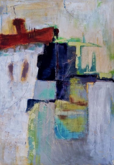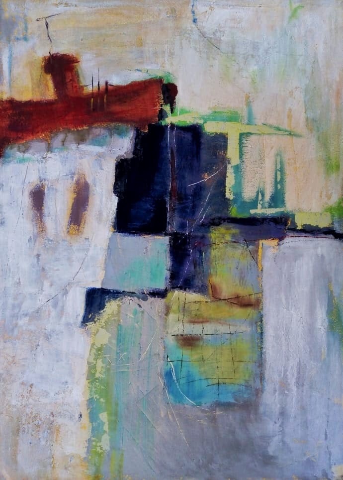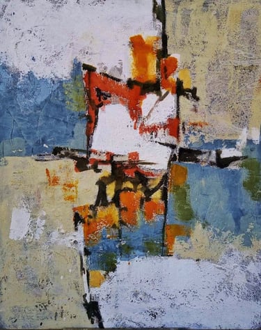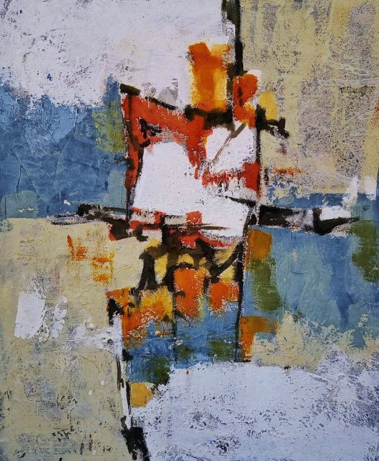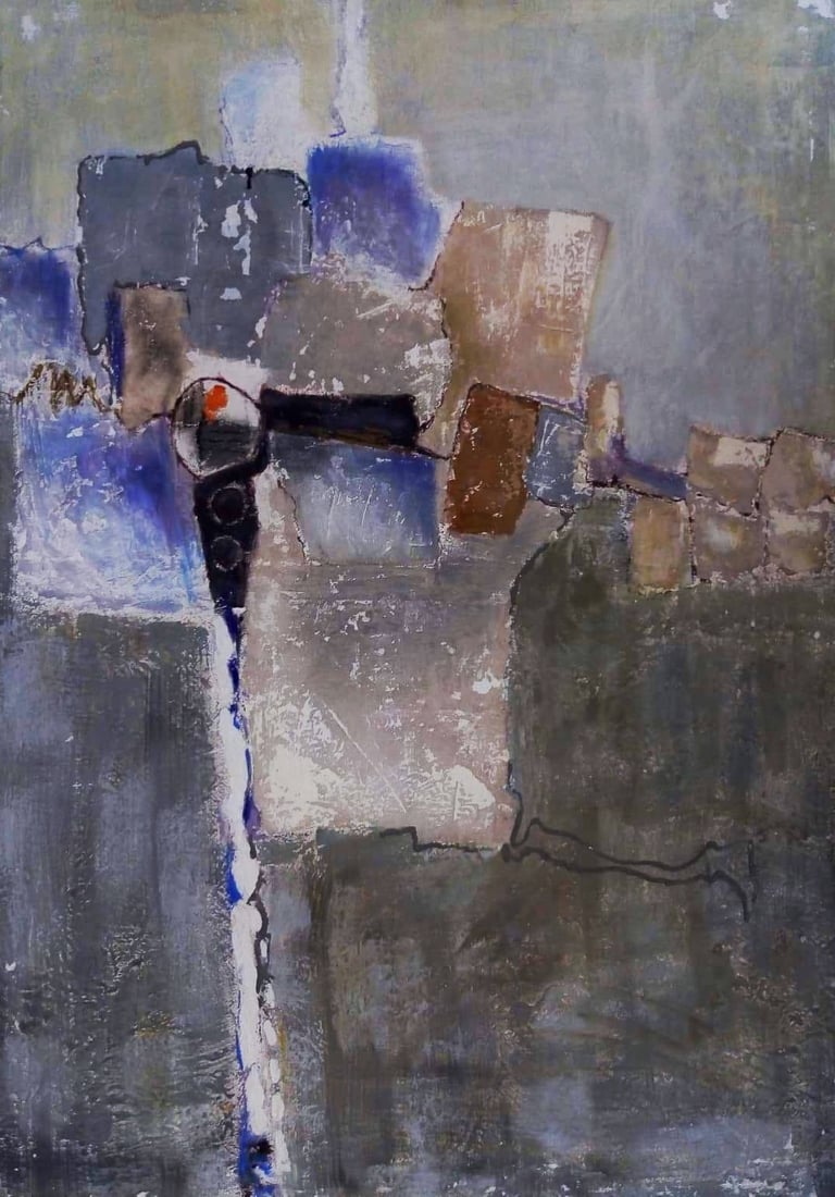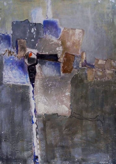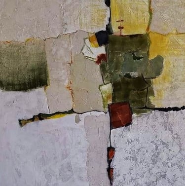 In the initial phase of my work, I conveyed my vision of the extent of destruction witnessed during the war in Syria. I began by depicting the destruction of buildings and their reconstruction in balance on the canvas using construction materials. My artworks took various forms, including squares, rectangles, and irregular circles, relying on visual memory to determine the shape. There was an accumulation of layers, with the lower layers retaining their texture, form, and color in the background, while additional layers on top aimed to create a balance between color blocks.